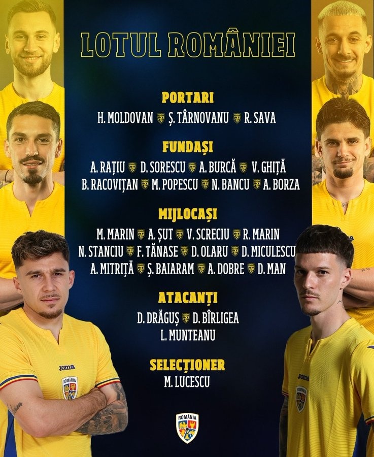 中场:苏特(布加勒斯特星)、马里乌斯-马林(比萨)、斯克雷丘(克拉约瓦大学)、拉兹万-马林(雅典AEK)、斯坦丘(热那亚)、奥拉鲁(布加勒斯特星)、塔纳塞(布加勒斯特星)、丹尼斯-曼(埃因霍温)、米库列斯库(布加勒斯特星)、米特里策(浙江)、拜亚拉姆(克拉约瓦大学)、多布雷(布加勒斯特快速)