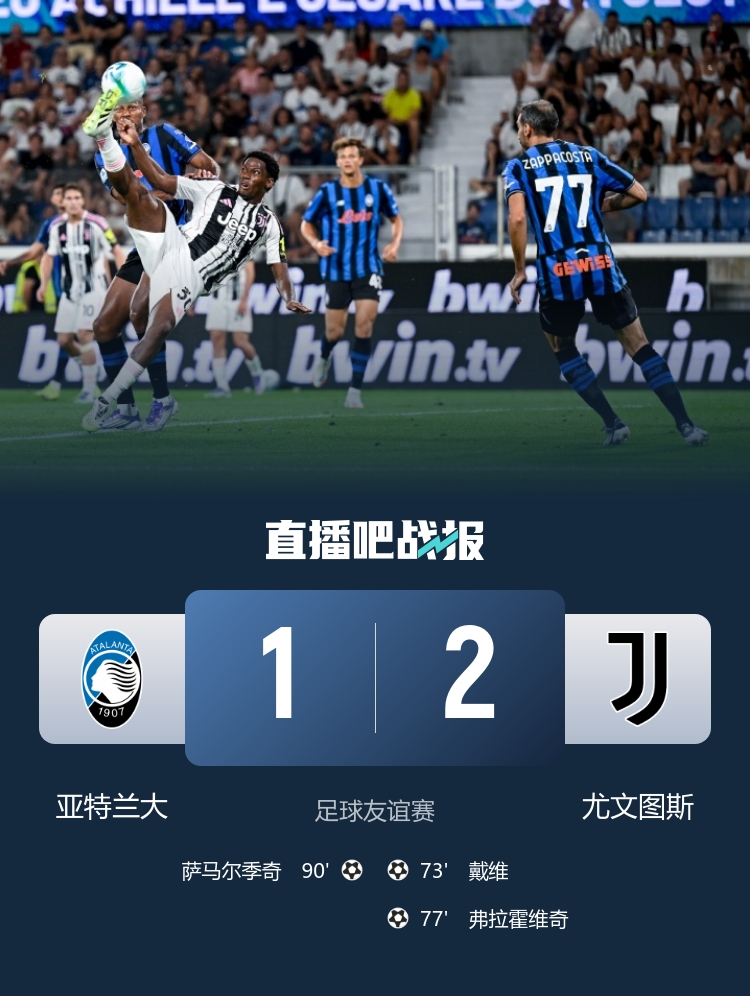 尤文在友谊赛2-1击败亚特兰大,新援戴维倒勾破门,弗拉霍维奇建功。